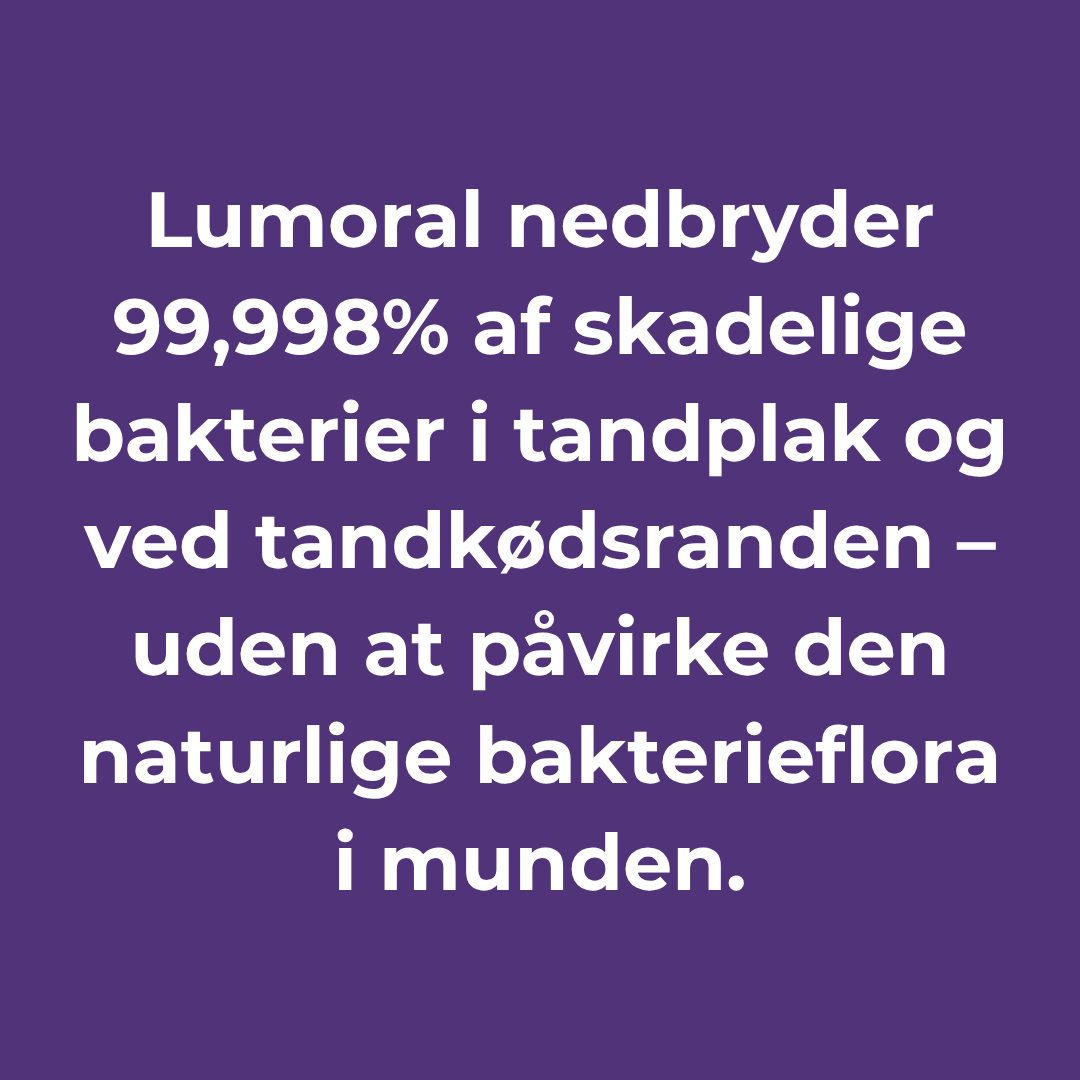 Lumoral fjerner bakterier på tændernes overflade, som forårsager tandkødsbetændelse, og stimulerer blodtilførslen til tandkødet for at fremskynde helingen.