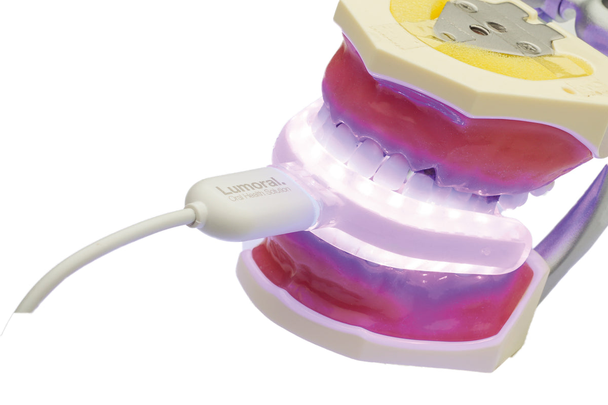 Lumoral®-mundstykket kombinerer to avancerede teknologier i én enhed: 405 nm antibakterielt blåt lys og 810 nm nær-infrarødt (NIR) LED-lys til antibakteriel fotodynamisk terapi (aPDT). Behandlingen udføres med Lumoral-mundstykket, som leverer 30 J/cm² strålingseksponering over en periode på 10 minutter.
