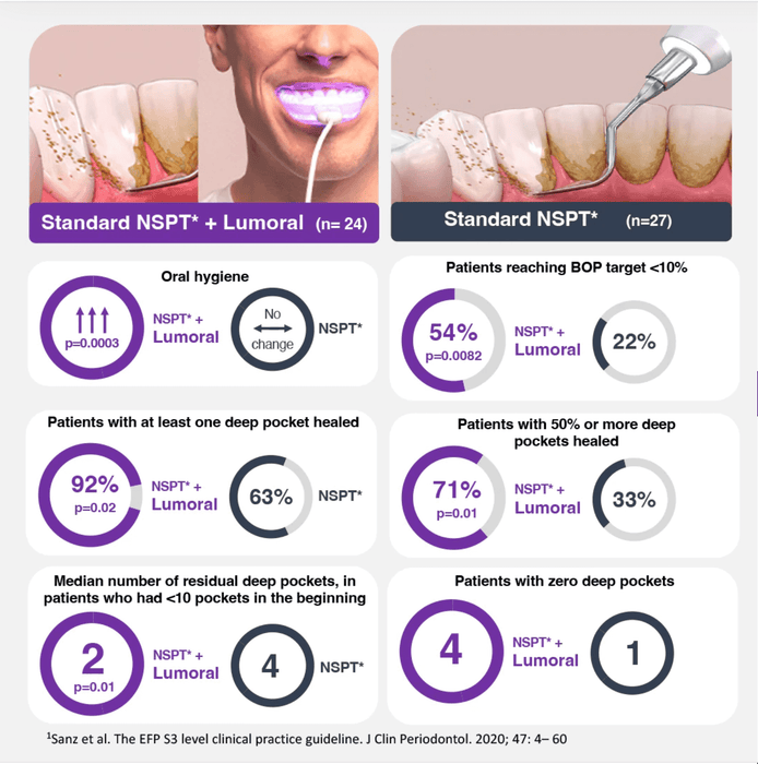 54% af de parodontale patienter, der brugte Lumoral® derhjemme, nåede tandkødssundhed (BOP <10%) i en 3 måneders undersøgelsesperiode. Regelmæssig brug af Lumoral® derhjemme reducerer tandkødsbetændelse og forbedrer mundhygiejnen. Det reducerer dybe lommer og multiplicerer effektiviteten af den professionelle ikke-kirurgiske parodontale behandling. Resultaterne er i overensstemmelse med erfaringerne fra tusindvis af Lumoral-brugere og tandlæger.